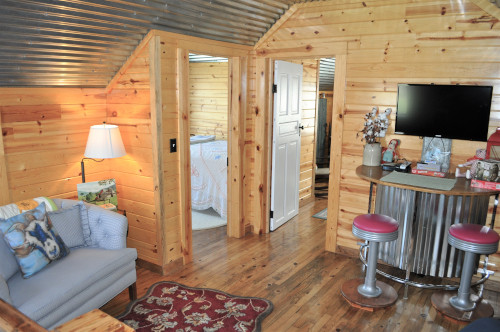 2 bed rooms, 1 bath room on main level, full kitchen, front and back covered porch, private Firepit, AC/Heat, TV.